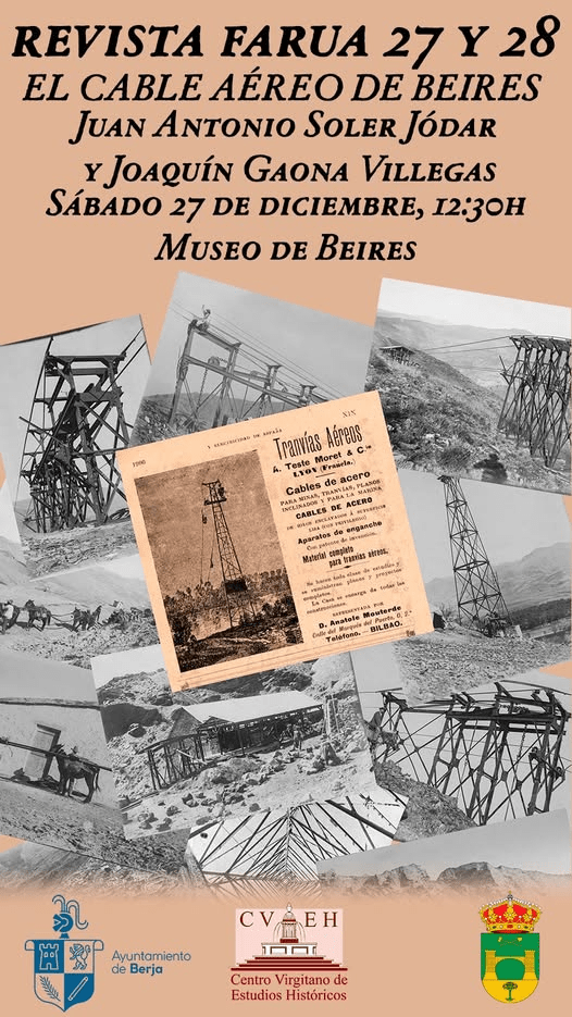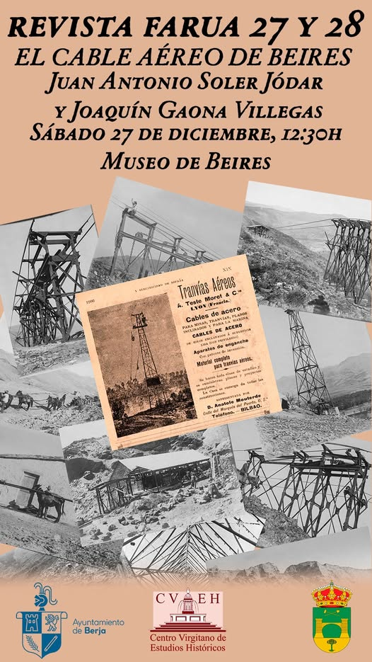 Arriba, presentación en Beires, junto a Joaquín Gaona Villegas, de los artículos publicados en FARUA sobre la minería y el cable aéreo de transporte de mineral de Beires a la estación de Doña María. Una pequeña reseña técnica para comprender la importancia del cable de Beires en la historia de la evolución tecnológica de estos ingenios, ya que supuso un punto de inflexión en su evolución a inicios del siglo XX, un ejemplo claro de la superioridad de las nuevas patentes alemanas sobre los obsoletos sistemas usados hasta entonces. Incidimos también en la relación que hubo entre la minería de mineral de hierro de Beires y la industria de construcción naval y, cómo no, la presentación de un impresionante álbum de fotografías que muestran, con un nivel de detalle nunca antes visto, cómo se instalaba una de estas líneas de transporte aéreo. Una grabación completa del evento se publicará en los medios en la página del Centro Virgitano de Estudios Históricos Berja-La Alpujarra.