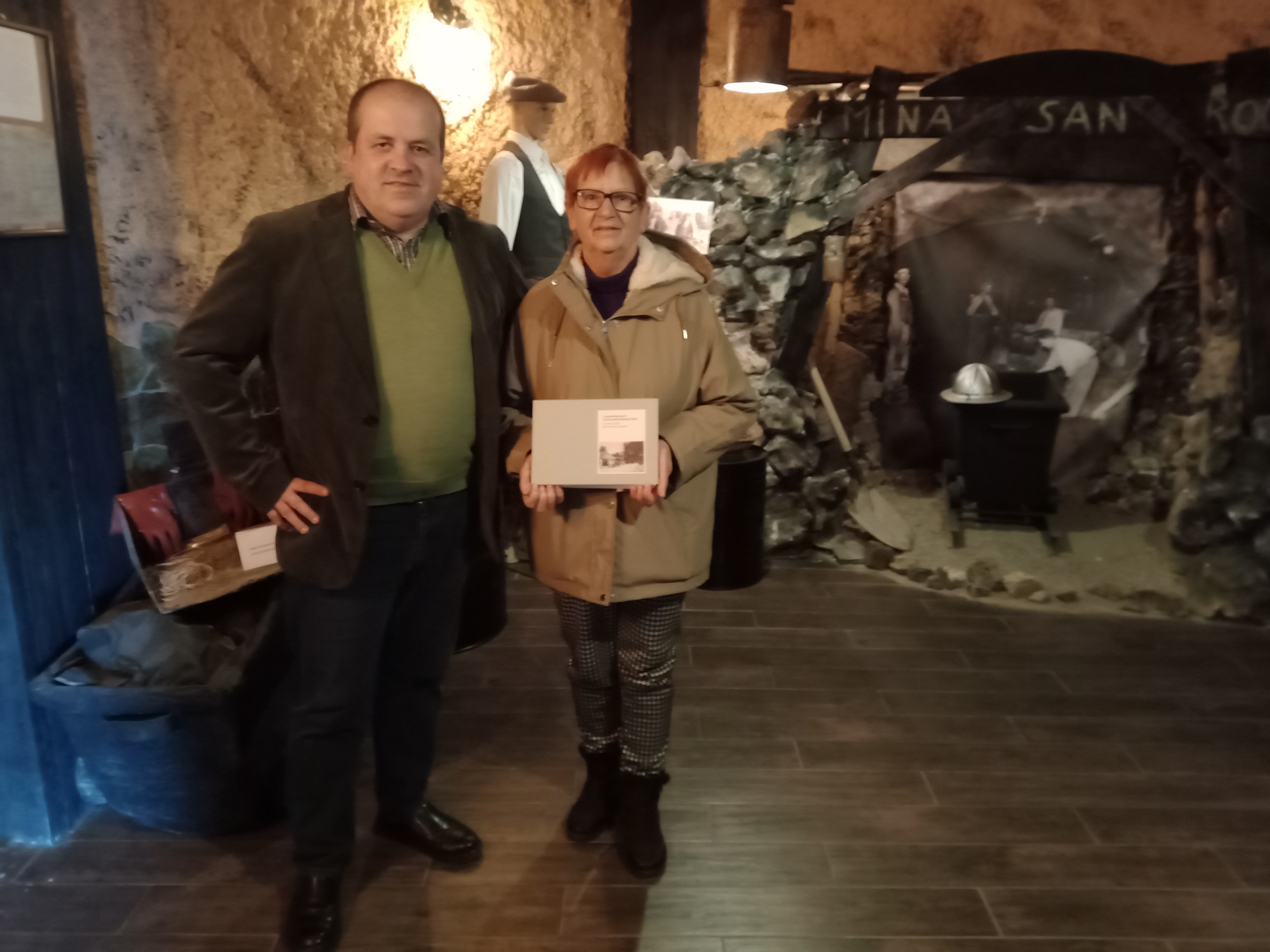 Arriba, Juan Antonio Soler y la alcaldesa de Beires, Carmen González, en el Museo minero de Beires, en el momento de la entrega de un ejemplar del libro «»La expedición minera de la sociedad Schneider (1898). Un viaje por el sureste español», recientemente publicado en Granada.