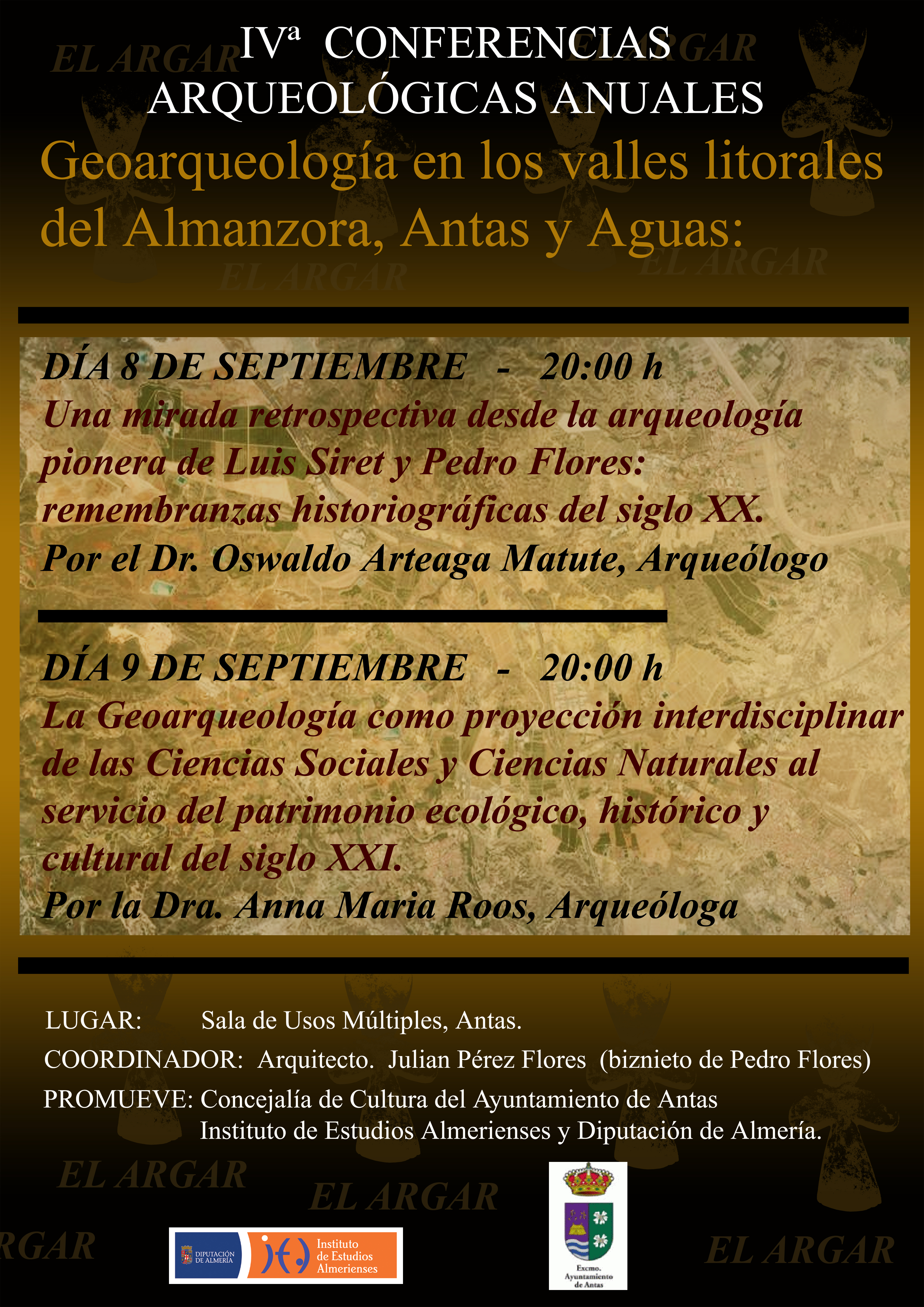 La conferencia que impartió D. Francisco Contreras Cortés, Catedrático de Prehistoria y Arqueología en la Universidad de Granada, en el Edificio-Museo Pedro Flores en Antas el pasado 22 de abril, fue presentada por la concejala de cultura del Ayuntamiento de Antas, Dña. Loreto Soler Campoy y coordinada por el presidente de la Asociación Amigos de El Argar (A.A.A.), D. Julián Pérez Flores, biznieto de Pedro Flores, que fue colaborador casi 50 años del ingeniero belga Luis Siret.