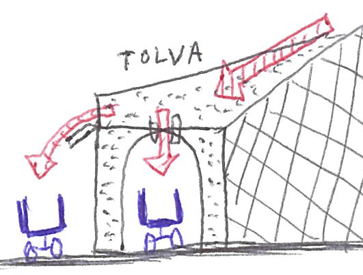 Hasta el momento, no se conocía ninguna fotografía histórica de esta tolva, y cuando finalmente y tras muchos años de esfuerzos conseguimos una, que data de 1903, resulta que nada era como lo pensábamos. Ya entraremos en lo que respecta a la tolva-embudo y el cargadero de Cuatro Amigos, pero casi no creíamos lo que veíamos. O más bien lo que no veíamos: nuestra icónica tolva, simplemente, no estaba. En su lugar solo había una simple trinchera delimitada por dos muros, con algunos contrafuertes, que se ubicaba en la parte inferior de una rampa-tolva, aprovechando la pendiente del cerro. La configuración es asombrosamente sencilla, sin compuertas que podamos apreciar ni muros que actúen como depósito. Adjuntamos unos esquemas sencillos que muestran las diferencias: