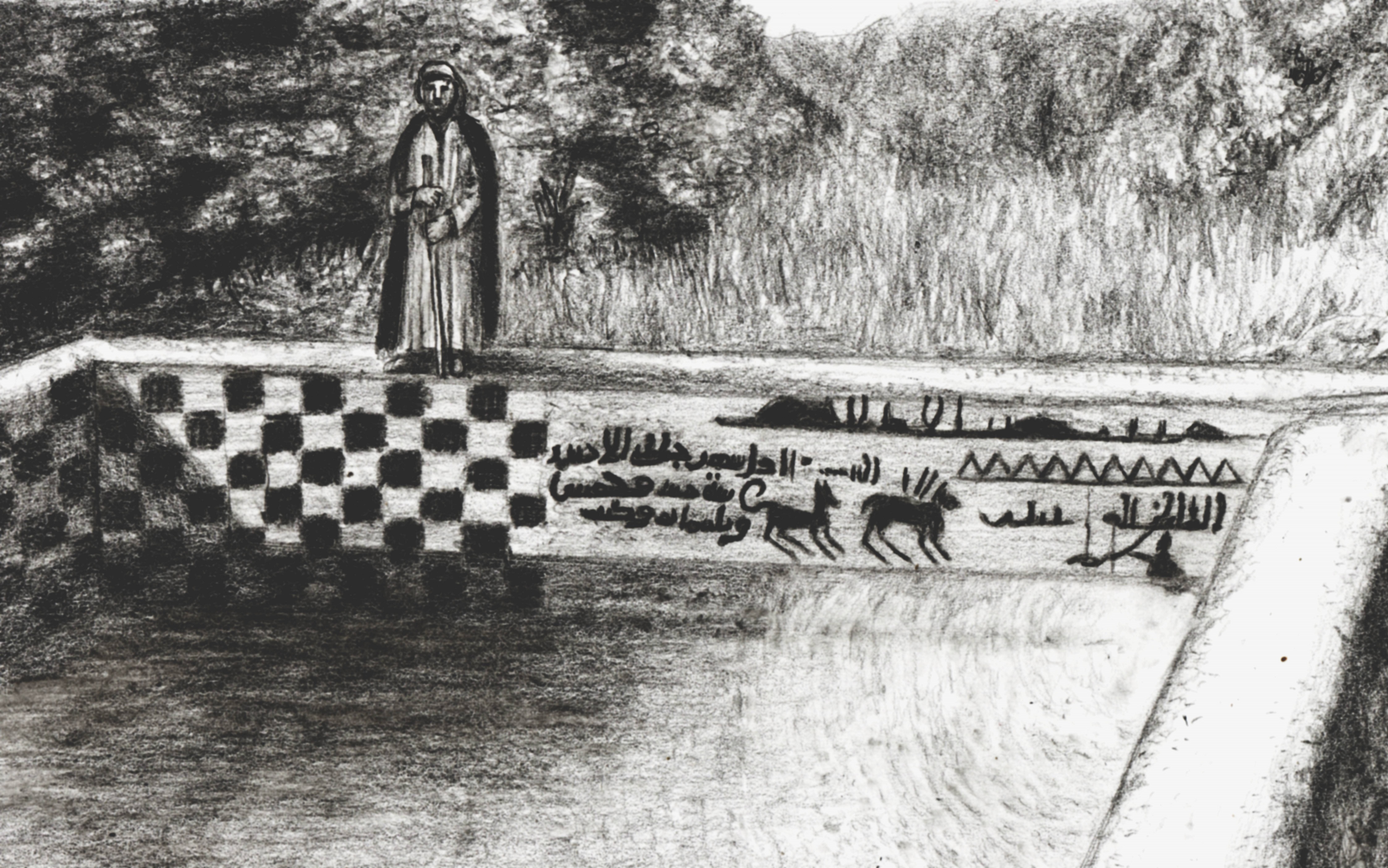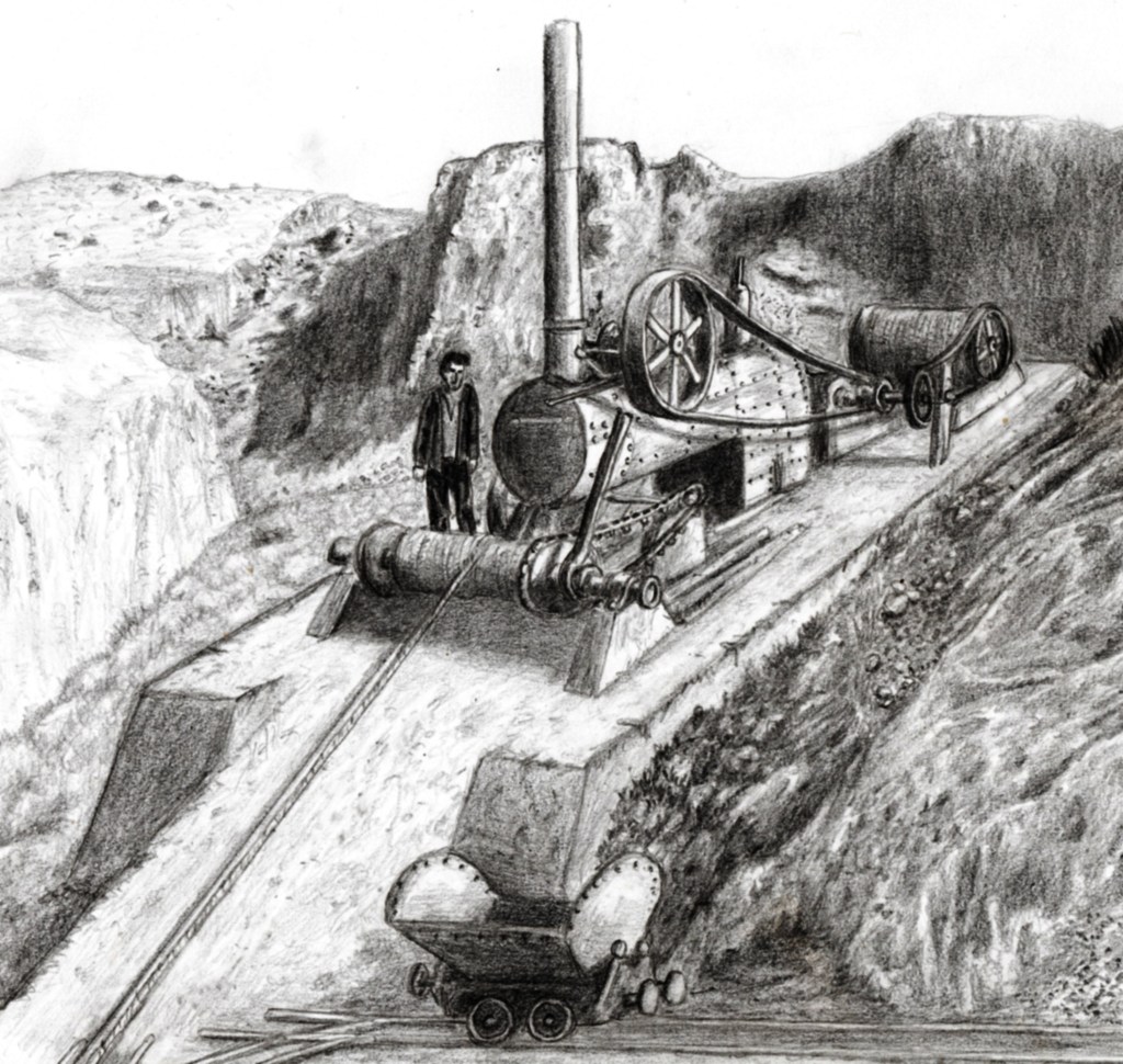 Principios del siglo XX (1905-1910). Reconstrucción del castillete del pozo P en la mina Mahoma (Serena). Se trata de un pozo de extracción accionado, más que probablemente, por una locomóvil.