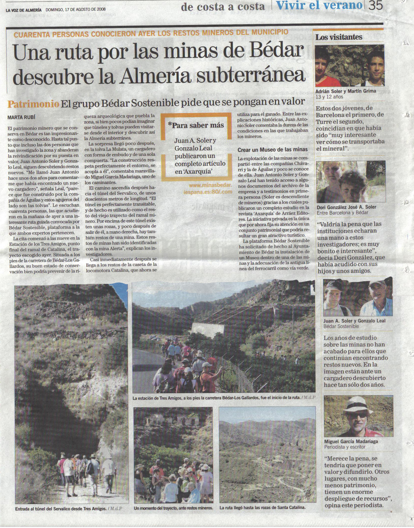 La primera gran excursión por las minas la organizamos en agosto de 2008, más de 40 excursionistas hicieron, por primera vez en grupo, la ruta que posteriormente seguiría tanta gente. Originariamente la llamamos «ruta de las Tolvas» debido a la gran cantidad de tolvas que se pueden observar, pero una vez registrada oficialmente se quedó en «Ruta de la minería». Sigo pensando que el nombre originario hace más justicia a ruta. El acontecimiento fue recogido por la prensa (la Voz de Almería) y aquí tenemos la noticia: