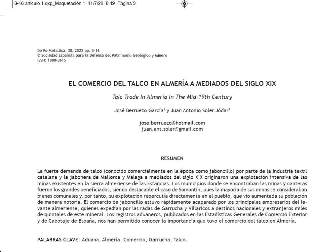 LA EXPLOTACIÓN DEL TALCO DE SOMONTÍN (ALMERÍA) DURANTE EL PERIODO DE ACTIVIDAD EMPRESARIAL DE MANUEL BERRUEZO AYORA (1845-1874)