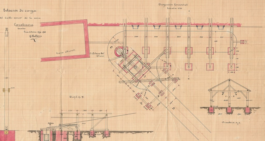 ¿De qué se trata exactamente? pues se trata de una verdadera reliquia del cable aéreo que se instaló desde las minas de Serena hasta Los Gallardos, en el punto de la Venta del Empalme de la Carretera de Almería-Murcia (Las Canteras), con 3.849 m. de longitud horizontal total. En Los Gallardos se contruyó un cargadero de 500 toneladas de capacidad desde el que se cargaba el mineral en camiones. La capacidad de transporte de este cable se era de 35 toneladas/hora. La construcción del cable se prolongó durante dos años bajo la dirección de Joaquín Larragoiti Larragoichea, ingeniero de la empresa vizcaína instaladora (García de Legarda, Hijo, domiciliada en Bilbao) y empezó a funcionar en 1956.