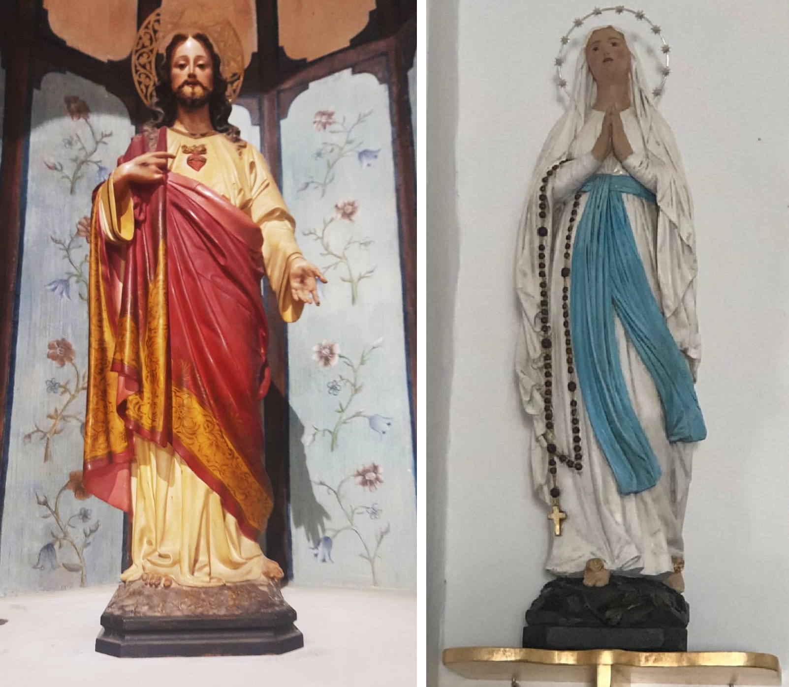 A la izquierda, el Sagrado Corazón original de la iglesia de El Pinar que fue expuesto en «Luces y Sombras». A la derecha, la Virgen de Lourdes, otras de las imagenes que se salvaron de la quema y que hoy se conserva (restauradada gracias a un particular) en la iglesia de Bédar. La imagen de San Fernando se cayó del Trono durante una procesión y no pudo ser reparado por el mal estado en el que se encontraba.