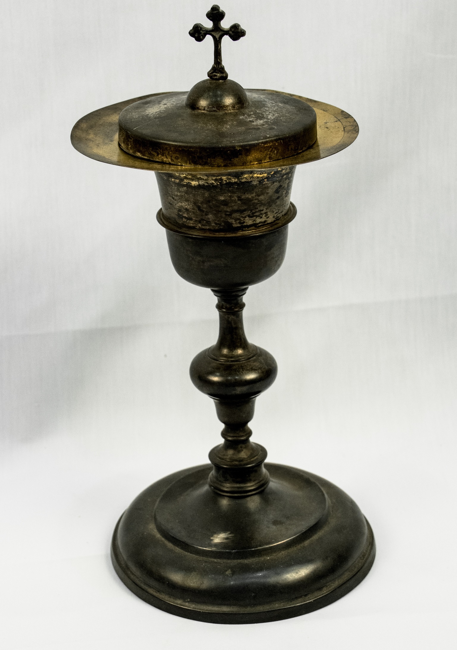 Copón de eucaristía originario de la iglesia de El Pinar en la exposición «Luces y Sombras» de Vera.