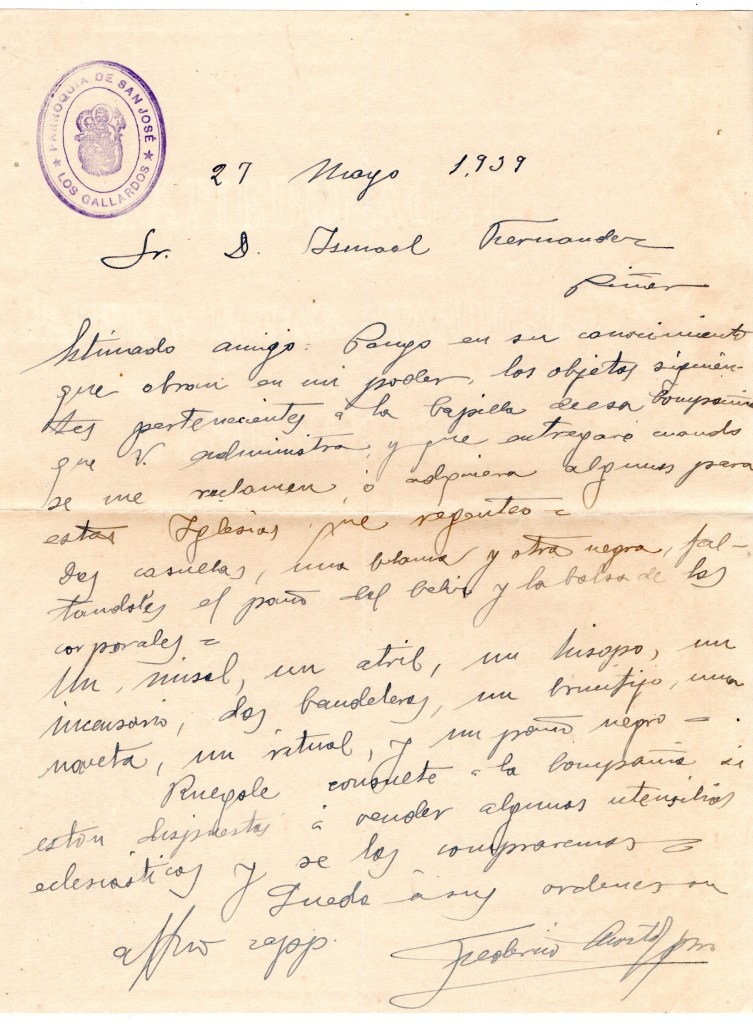 Al parecer, Ismael Fernández no solo consiguió salvar las imágenes, también todo lo demás. Una vez finalizada la guerra, las iglesias de los pueblos colindantes comenzaron a solicitar a la sociedad minera que les prestaran los elementos necesarios para realizar las liturgias, y para demostrarlo presentamos algunos documentos muy esclarecedores al respecto. En una carta del párroco de Los Gallardos de 27 de mayo de 1939, se pide el precio por una serie de elementos que les habían prestado, entre los que se incluía un Vía Crucis y un Confesionario. En otra carta de 14 de mayo de 1940, el párroco de Turre solicitaba al ingeniero el precio de 14 cuadros del Vía Crucis que le habían dejado, así como el Confesionario y dos candelabros. Presumiblemente, tanto el Confesionario como el Vía Crucis son los mismos que se habían prestado anteriormente a la iglesia de Los Gallardos. En otra carta de 20 de septiembre de 1941, el párroco de Antas y Bédar, José Sirvent, solicitaba el cáliz, para poder consagrarlo y usarlo en los oficios.