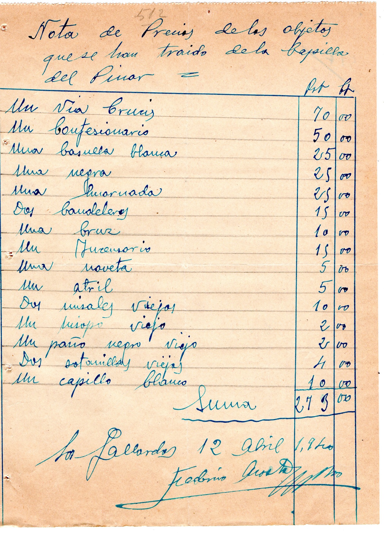 Finalmente, y ante la necesidad de desmantelar todos los edificios, la sociedad minera acabó vendiendo muchos de esos efectos en 1941, como lo demuestran los recibos que hemos recuperado. Así, sabemos que el Confesionario fue adquirido finalmente por la iglesia de Turre por 75 pesetas, además de un Trono por 120 pesetas. Bédar recuperó las imágenes de San Fernando y de una Virgen, dos pilas de agua bendita, el retablo con todas sus repisas, una lámpara del Santísimo, un Sagrario, dos armarios, un Catafalco y una cómoda. Todo estaba tasado en más 1.500 pesetas, aunque fue un regalo para el pueblo.