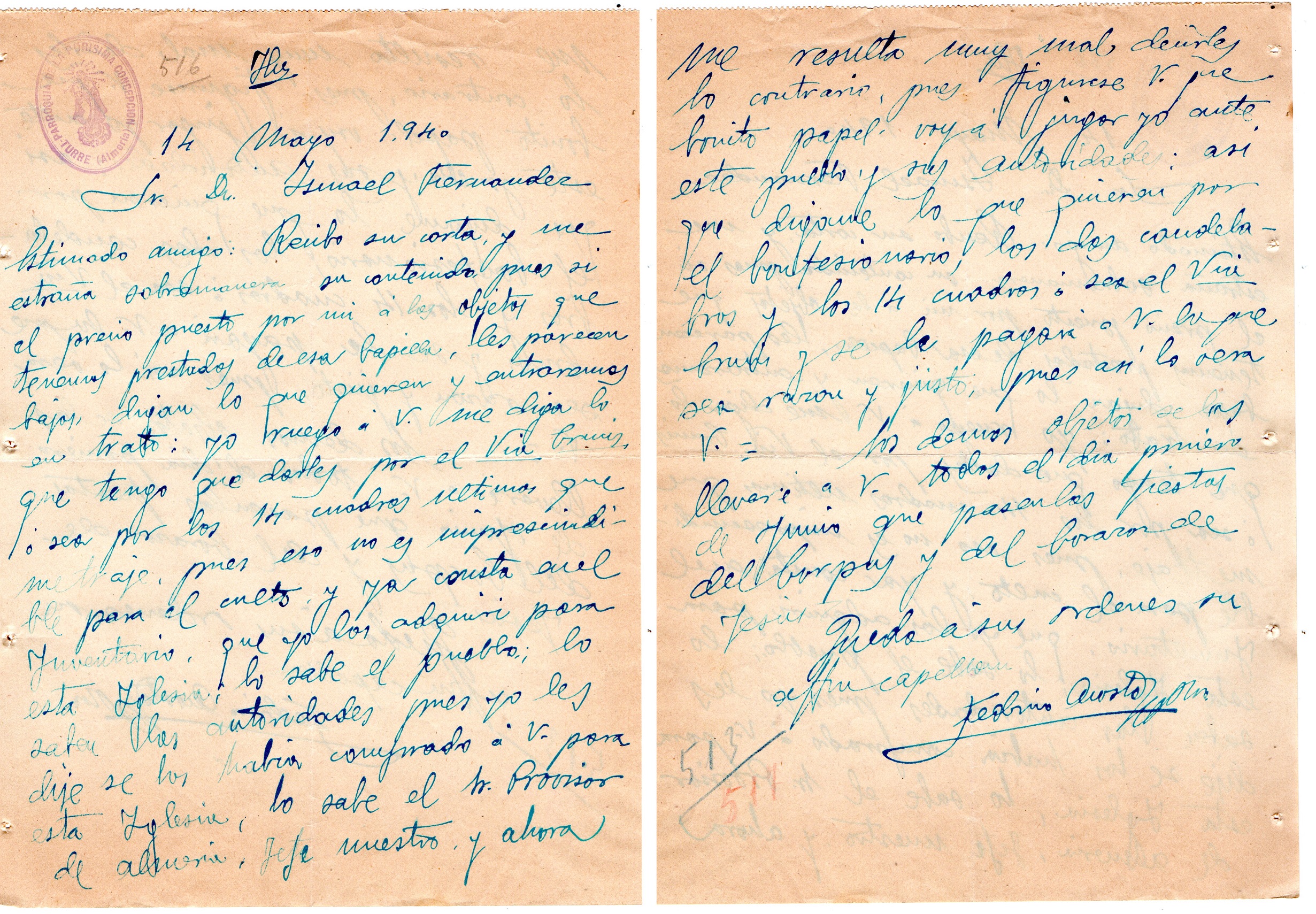 Carta del párroco de Turre de mayo de 1940 pidiendo precio por 14 cuadros del Vía Crucis y un Confesionario.
