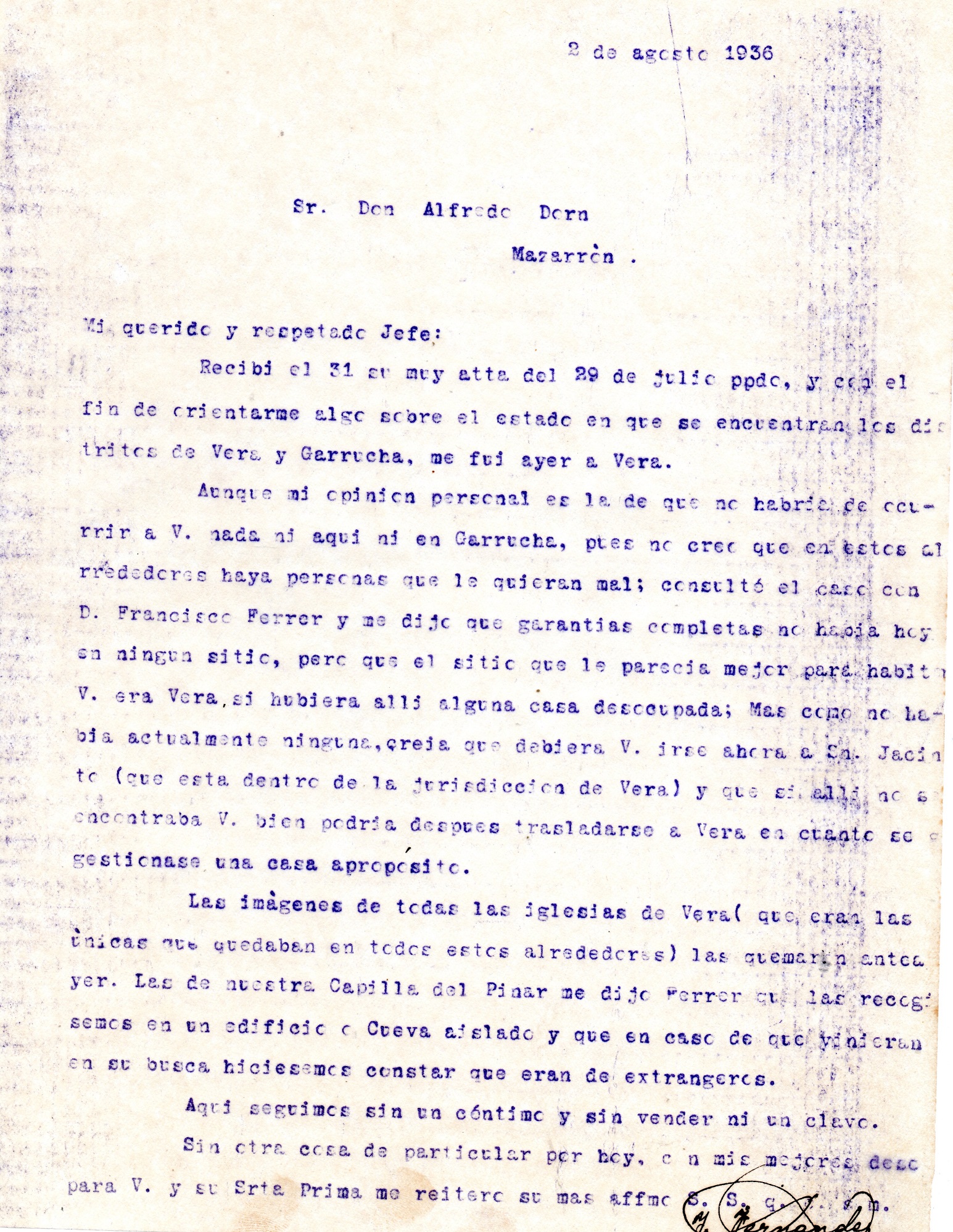 Un documento excepcional de 2 de agosto de 1936, al poco de comenzada la guerra, nos indica claramente cómo y por qué se salvó esta iglesia. Fue el ingeniero Ismael Fernández el encargado que se quedó en el poblado durante toda la guerra, y fue realmente gracias a él que la iglesia se salvó. En esta carta, el ingeniero escribe al director general de la Compañía, el alemán Alfredo Dörn, que estaba en Mazarrón cuando estalló la guerra. Como súbdito alemán, Dörn no tardó mucho en salir de España por Cartagena, dejando a Ismael como encargado. Ismael relata cómo había estado en Vera para ver al abogado de la Compañía, relatando como las imágenes de todas las iglesias de Vera, que hasta entonces eran las únicas que quedaban en todos los alrededores, habían sido quemadas hacía dos días, y que estaba preocupado por las de la capilla de El Pinar. El abogado, Francisco Ferrer, le había aconsejado que las imagenes de la capilla “las recogiésemos en un edificio o Cueva aislado y que en caso de que vinieran en su busca hiciésemos constar que eran de extranjeros”.