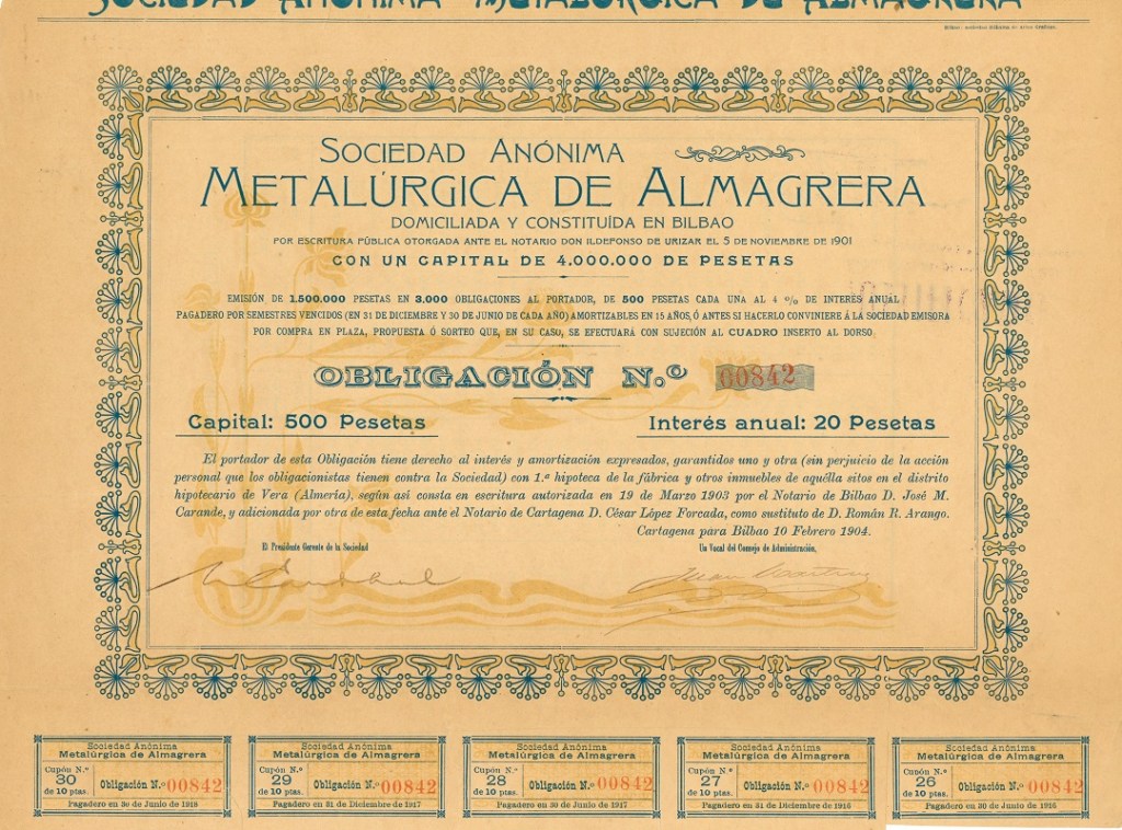 Recibo de los objetos cedidos al ayuntamiento de Bédar «regalo al pueblo» por parte de la filial de la Compañía de Águilas.