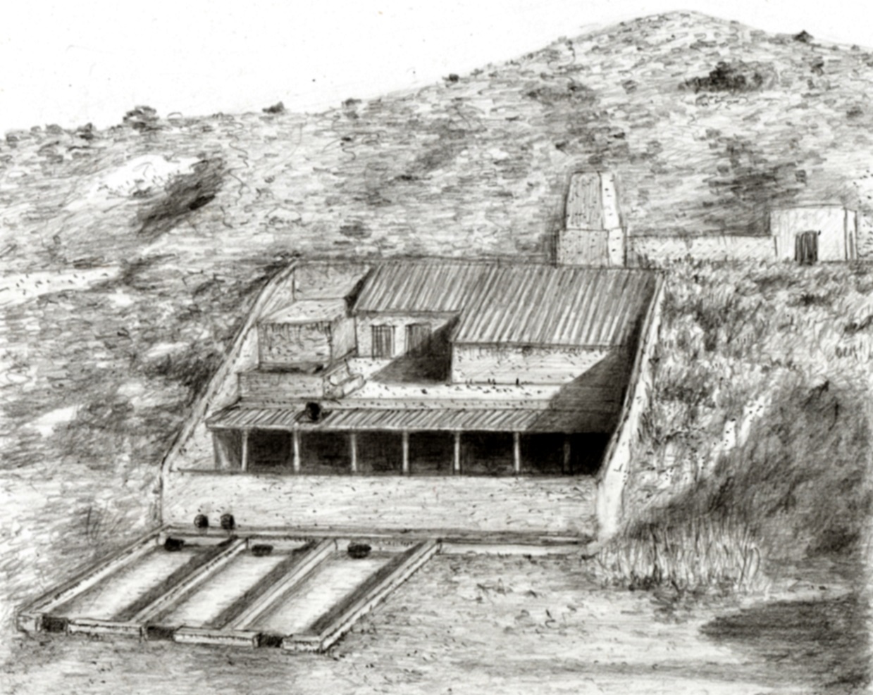 Reconstrucción de la capilla/iglesia de El Pinar de Bédar. El campanario se puede ver en una fotografía de 1910 y los planos de una empresa minera nos ubican dicha iglesia en el lugar marcado con color azul en la fotografía de las ruinas que acompaña a la ilustración.