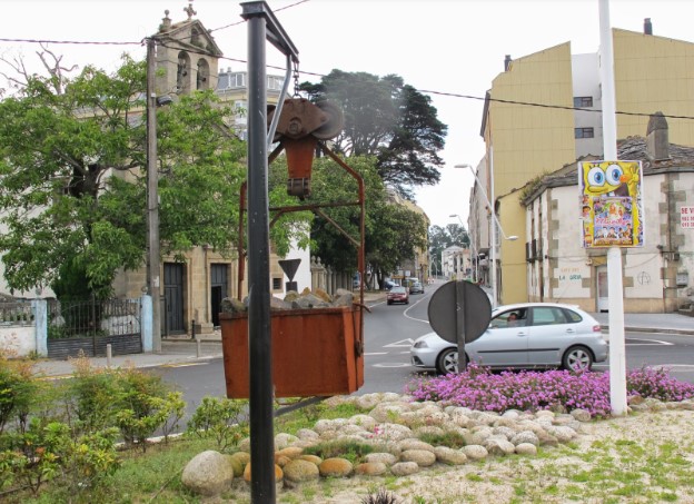 A la izquierda, columna de cable preservada del funicular entre Novo y Sierra. A la derecha, vagoneta Bleichert preservada en Viveiro (Lugo).