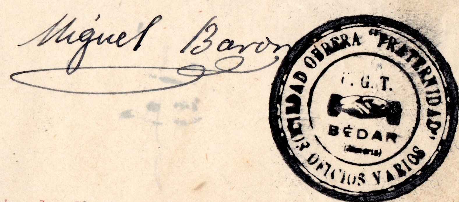 Un sello del Sindicato Obrero «Fraternidad» de Oficios Varios de Bédar. El nombre seguramente sonará a muchos bedarenses.