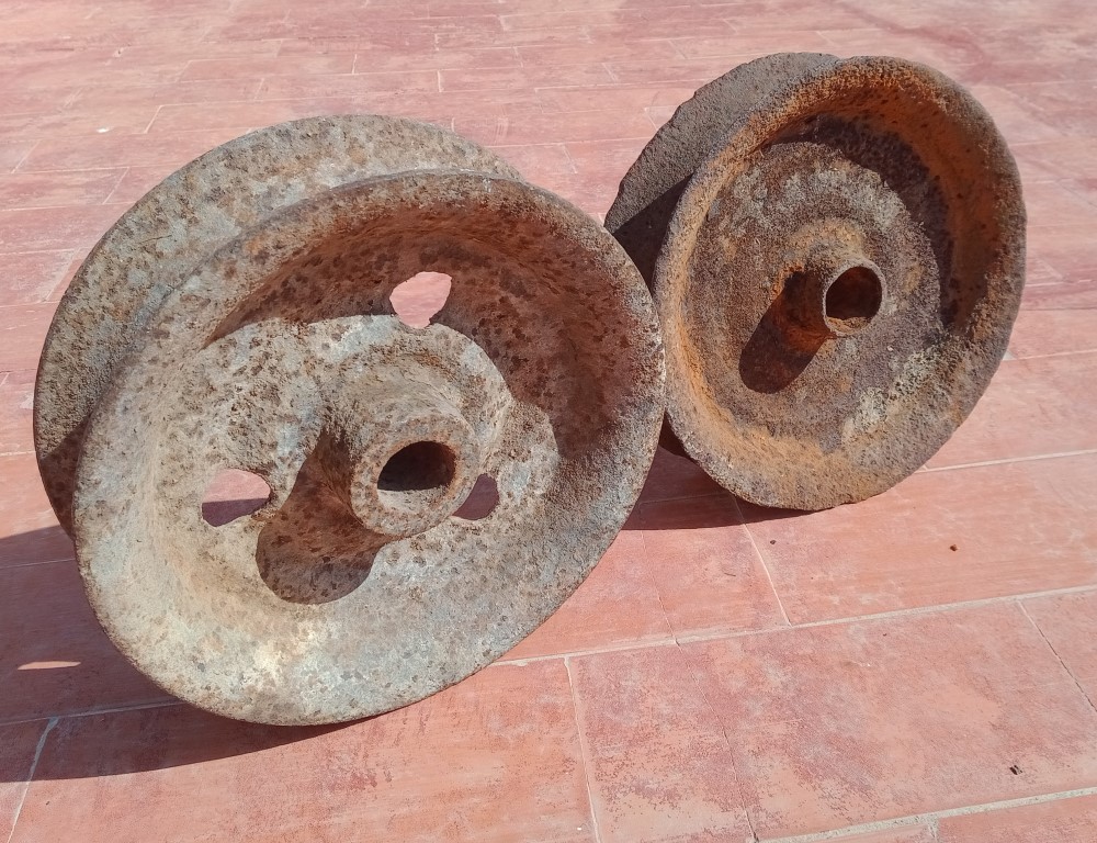 Dos ruedas de vagoneta aérea recuperadas en la sierra de Bédar en el trazado del antiguo cable Bédar-Garrucha, con algunas diferencias. En Bédar funcionaron diversos cables, sistema Pohlig, Bleichert y Roe.