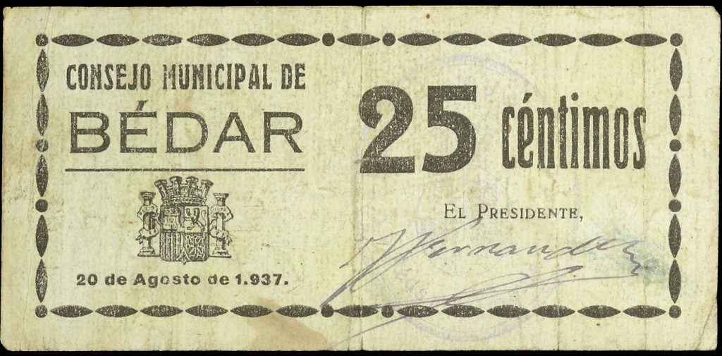 Un ejemplo son los billetes de Bédar, que son unos de los más buscados y que más precio alcanzan en subastas. Especialmente los valores más escasos, el de 1 peseta y el casi imposible de encontrar de 2 pesetas, superan sin problemas los 300 euros. En una de las últimas subastas un ejemplar de 2 pesetas superó los 400 euros en pujas antes de que dejamos de seguirlo (desconocemos hasta dónde llegó) y una reciente subasta en Todocolección por los valores de 1 y 2 pesetas superó los 800 euros, toda una locura.