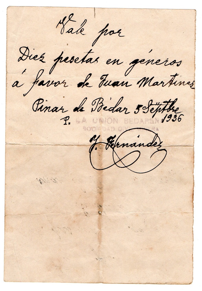 Vale improvisado nominal para 10 pesetas en géneros en el comercio de referencia de la sociedad minera la Unión Bedareña, de septiembre de 1936, el único vale de este tipo que hemos podido localizar en la provincia de Almería.