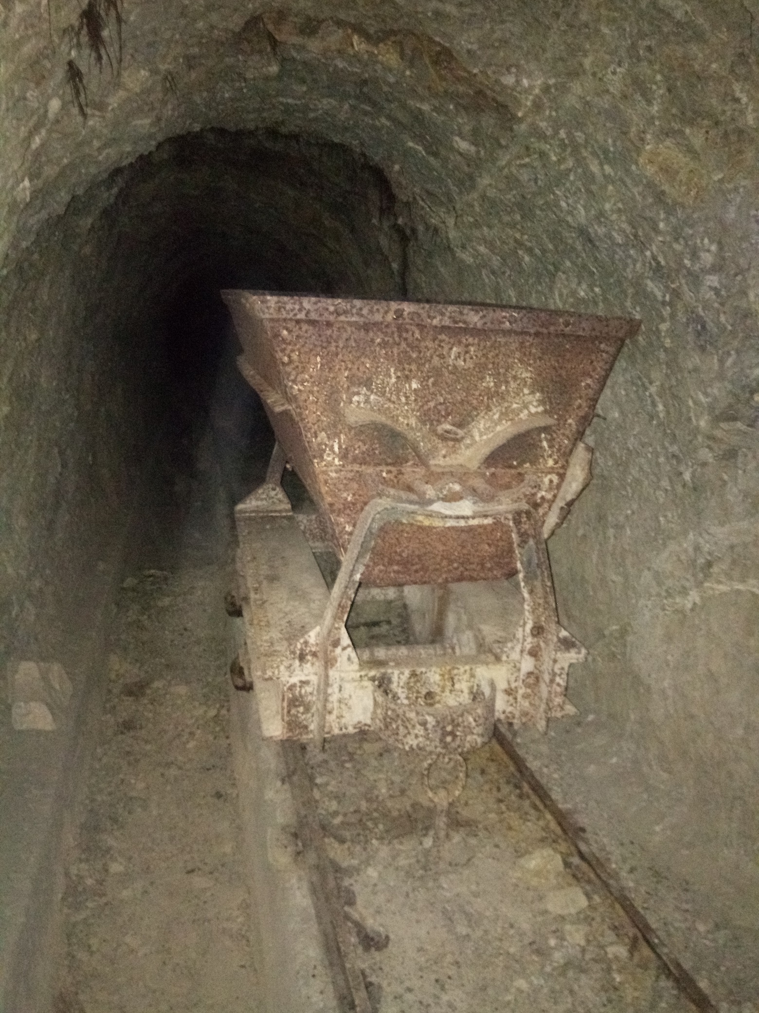 Tramo de vía minera y vagoneta de descarga lateral Decauville conservada en la mina Desagüe.