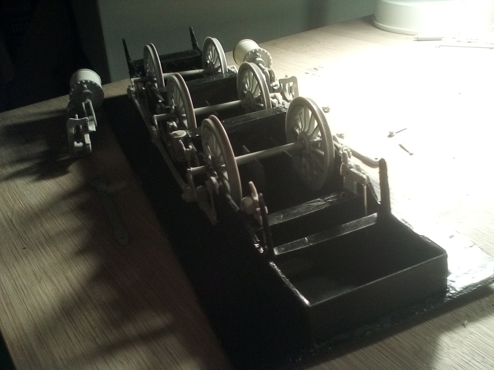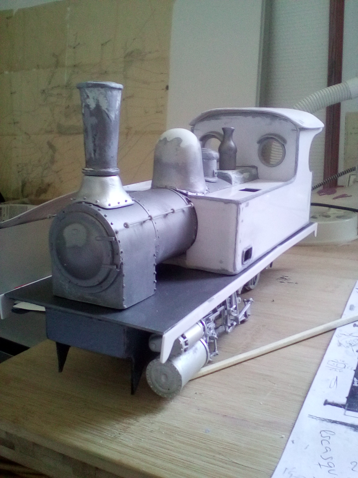Para el modelo a escala decidimos trabajar con materiales con los que ya teníamos algo de experiencia: poliéster de modelismo, resinas y alambre. La escala elegida de 1:25 nos dejaba una composición locomotora-vagón (incluida la base) de casi 54 cm de largo y 24 de alto, lo que permitiría un buen detallado que aportara realismo al modelo, que fuera un fiel reflejo de estas máquinas tan cercanas a obras de arte.
