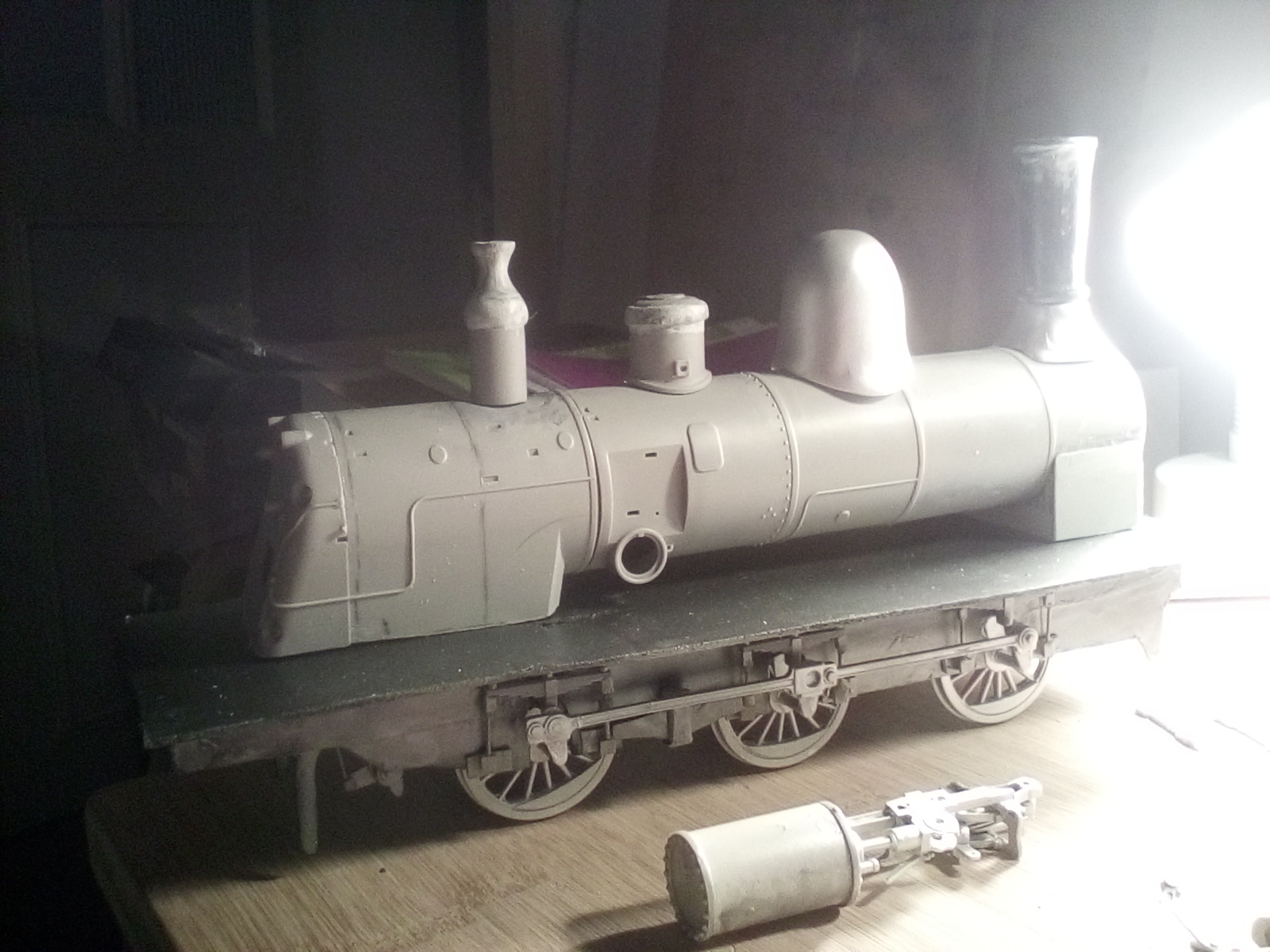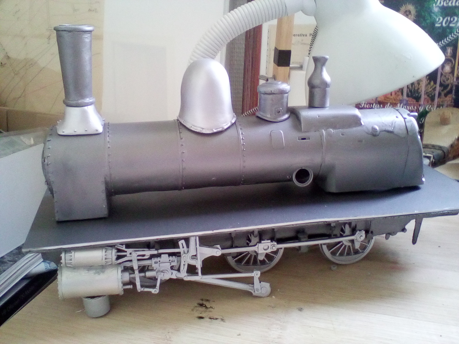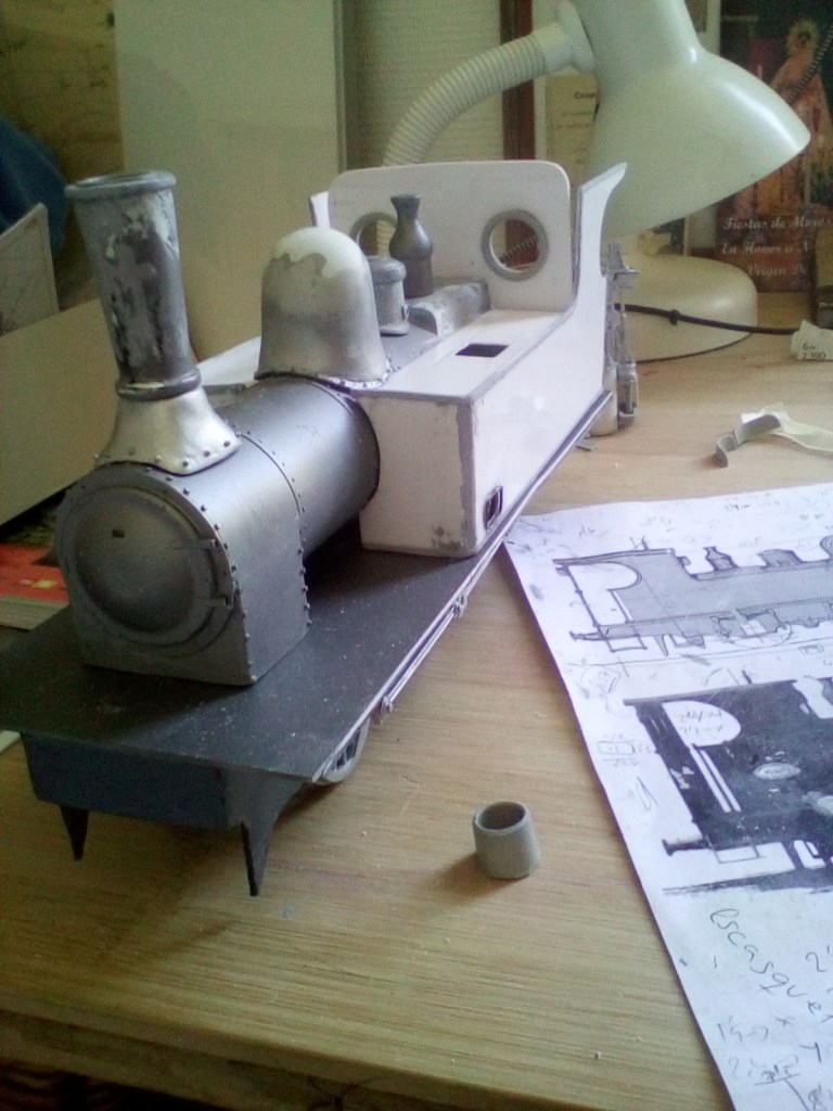 Obviamente, la parte más difícil de realizar fue el bastidor y ruedas, en especial en este modelo en el que las ruedas se encuentran en el interior del bastidor, los cilindros y las complicadas conexiones y bielas que lo conectan con las ruedas. Una vez acabado empezamos con la caldera y todos los elementos que soporta: chimenea, domo, arenero y cobertura de las válvulas de seguridad.