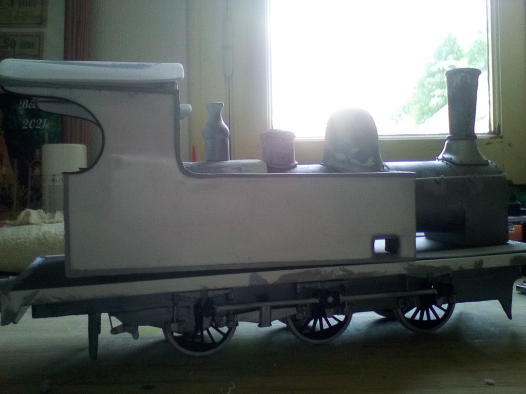 Conseguir la forma y dimensiones correctas del domo y de la chimenea no fue tampoco tarea fácil, especialmente por las escasas fotografías conocidas de estas locomotoras. Una vez conseguido, pasamos a confeccionar los depósitos laterales y la estructura exterior de la cabina. En esta fase empieza ya el trabajo de hiperdetallado, con la colocación de los remaches (sí, a mano y uno a uno) barandillas, registros, asideros… Alguna de las piezas, en especial la caldera, reciben capas de pintura metálica para poder observar más fácilmente y corregir toda imperfección. El domo se va corrigiendo progresivamente hasta que alcanza la forma deseada.