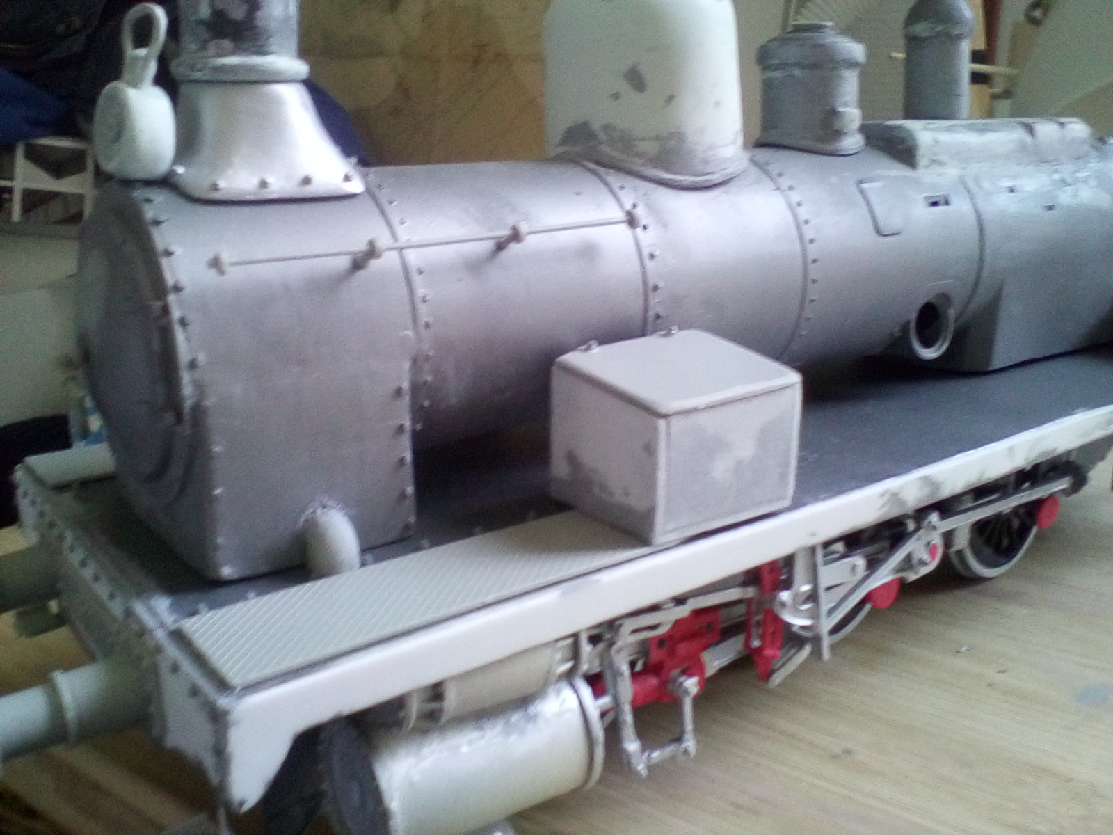 Tras solidarizar definitivamente ambas partes de la locomotora, procedimos a completar todos los detalles y finalizar domo y chimenea, así como a fijar definitivamente los cilindros y poner la plancha protectora que la cubría, así como otros detalles como las cajas laterales, topes, escalerillas, apoya pies, enganches, tuberías, válvulas, diversas barandillas… Se aplican también las pinturas acrílicas definitivas, básicamente negro mate y rojo, usando un aerógrafo de doble efecto. La locomotora ya va tomando la forma deseada.