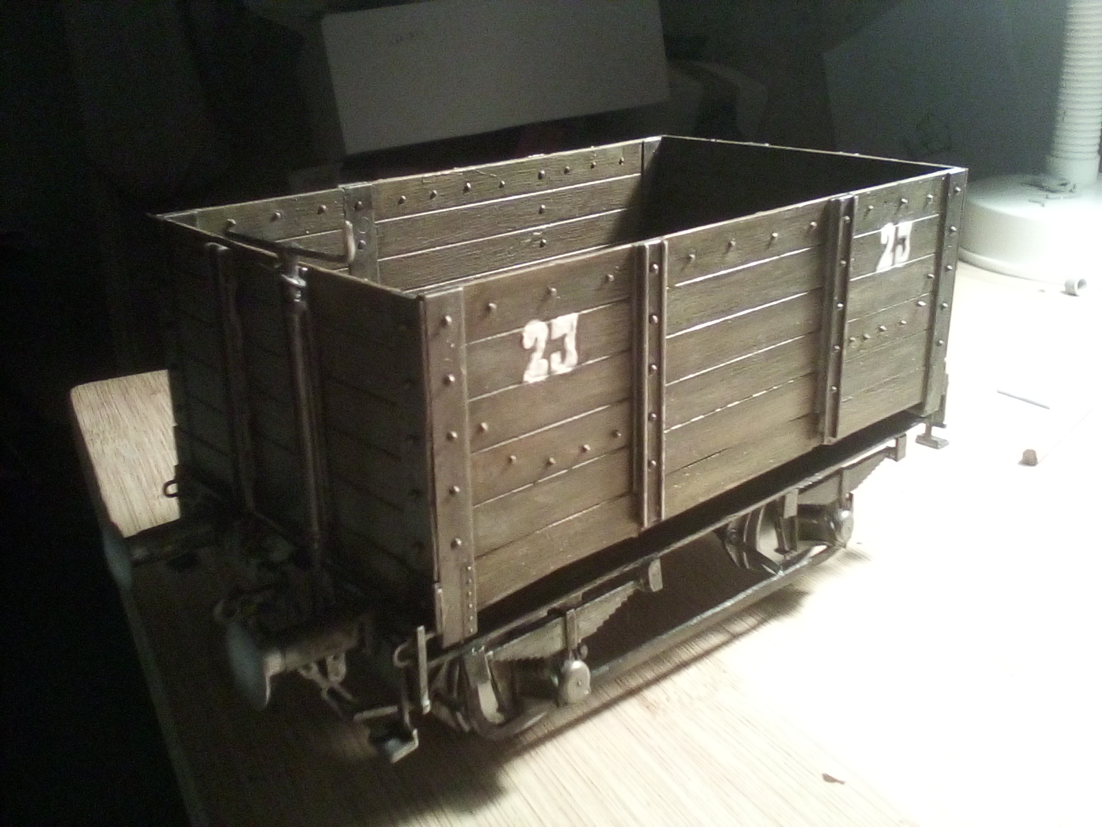 A pesar de la falta de información, la construcción de la vagoneta es mucho más sencilla que la de la locomotora. Se representa el número 23 por partida doble en ambos lados, tal y como las llevaban en las fotografías conservadas. Curiosamente, parece que no llevaban las siglas de la compañía (CLC por Chávarri, Lecoq y Cía), como sí que lo hacían las vagonetas de 4 toneladas de los ramales.