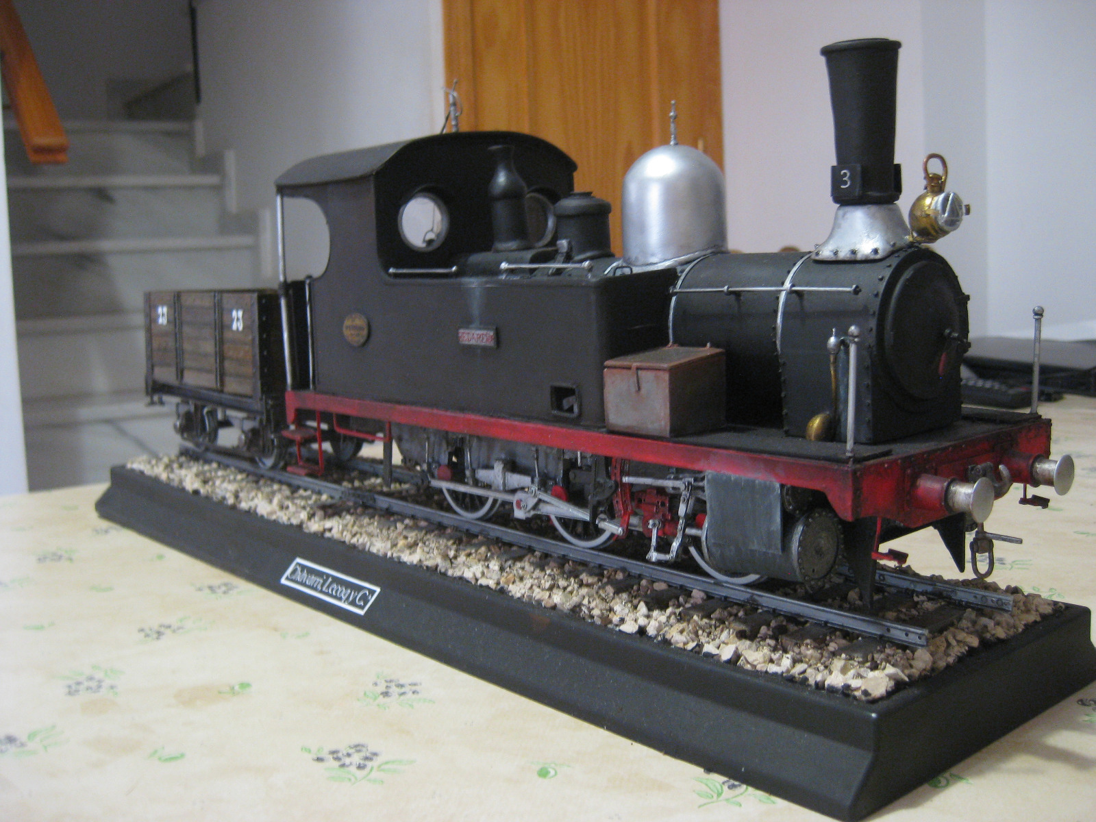 Aspecto final de la locomotora 030T caracterizada como la n.º 3 «Bédar» del ferrocarril Bédar-Garrucha, con un vagón de mineral ya finalizado y antes de er protegido por una vitrina. El vagón de mineral, identificado con el número 23 tal y como estaban los vagones originales, está cargado con mineral de hierro auténtico de Bédar. El balasto de la vía también está confeccionado con material genuino procedente de una cantera.