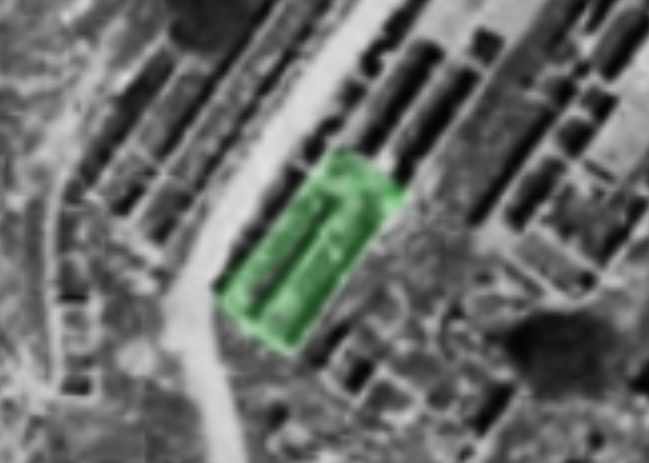 Fotografía de las ruinas de El Pinar hacia los años 70/80 y ubicación de la capilla/iglesia según unos planos posteriores de la empresa TRAMISA que realizó trabajos en la zona. Con la flecha roja se muestra lo que parece que fue uno de los nichos de la misma. A pesar de lo que indican los planos, es posible que la construcción a la izquierda no fuera más que una vivienda más y que la iglesia solo fuera el edificio central.
